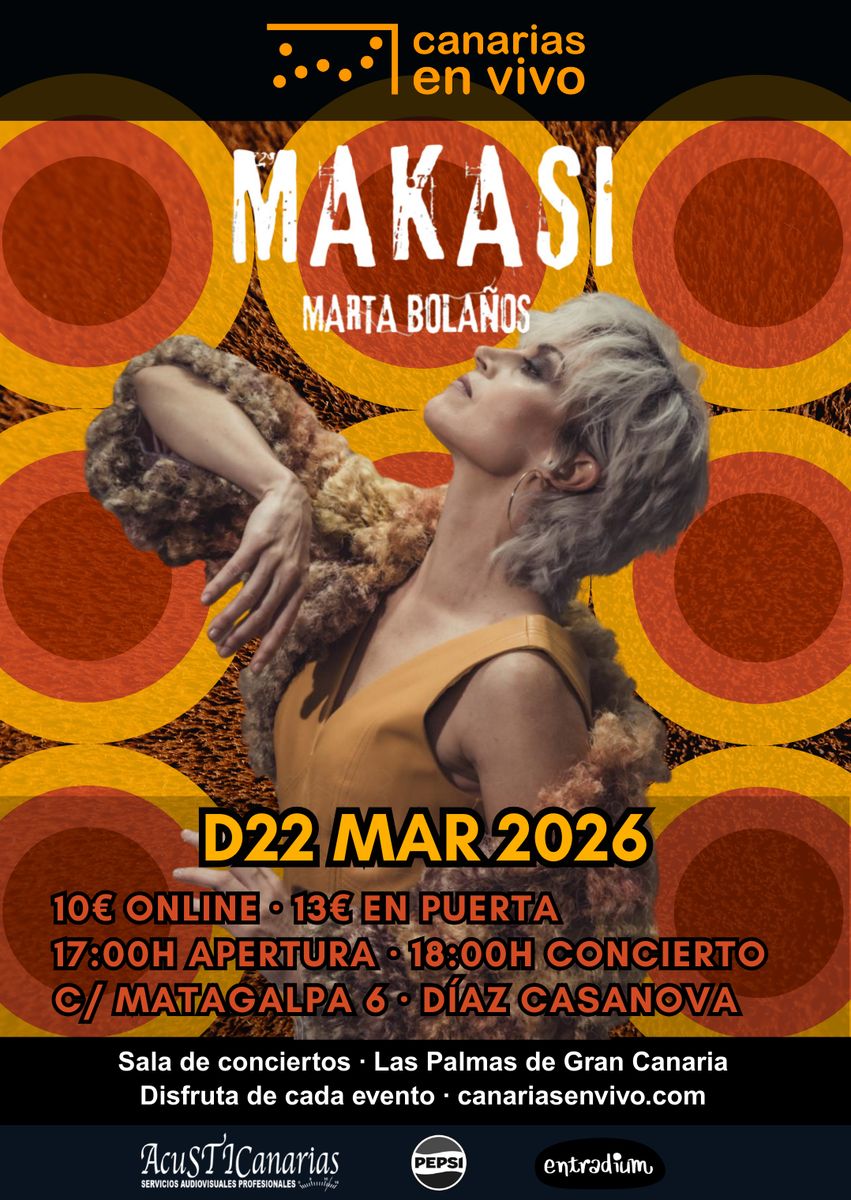 MAKASI is a musical project from the Canary Islands that fuses local folklore with Afro rhythms from Macaronesia. It explores the cultural connections between the islands of the North Atlantic through creativity, research and music, giving life to an innovative proposal with deep roots. Real connection. Sunday, March 22, 2026 Venue: Sala de Eventos Canarias en Vivo Doors open: 17:00 Concerts start: 18:00 Tickets: €10.52 online and €13 at the door.