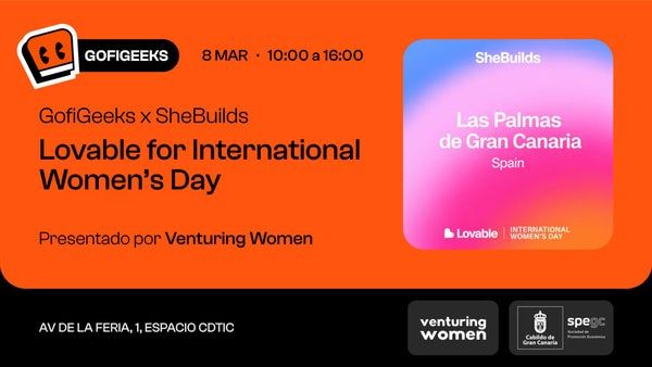🎟️ Nivel: No se requiere experiencia **¡Un evento único!** Prepárate para unirte a un evento a escala mundial y crear tu propia aplicación gracias al Vibe Coding. Con motivo del **Día Internacional de la Mujer**, el líder mundial en **Lovable** organiza un hackathon online a nivel mundial destinado a que las mujeres una aplicación usando Vibe Coding. En colaboración con **[Venturing Women](https://www.venturingwomen.org/)** y gracias al apoyo de la **SPEGC**, vais a poder disfrutar de este evento de manera presencial junto con la comunidad. ¡Ojo! Aunque está destinado a mujeres, no excluye a los hombres. 🚀 **¿Qué haremos?** Tras las presentaciones habrá una introducción a **Lovable** y al **Vibe Coding** para que aquellas personas que no tienen experiencia con la herramienta puedan comenzar a utilizarla. Esta parte será en inglés. Durante el resto del evento habrá compañeros que podrán aclarar dudas en español. Una vez que los participantes hayan decidido qué hacer, gracias a créditos que aportará **Lovable**, las participantes podrán crear una aplicación utilizando las funcionalidades de la plataforma 🌐 **Evento mundial** Anímate a disfrutar del Día de la Mujer de una forma diferente. Ven a conocer a aprender junto con otras compañeras como empezar a crear tus proyectos técnicos. Incluso si no tienes experiencia previa. 🤔 **¿Qué necesito?** A parte de muchas ganas y un ordenador portátil, estaría genial si ya traes de casa una idea que quieras implementar. Si no es así, no te preocupes. Tendremos un brainstorming y algunas propuestas preparadas para que no te falten las ideas. ✨ **¿Y después qué?** Lovable ofrecerá descuentos a las participantes para que, tras la finalización del evento, puedan seguir desarrollando y puliendo la aplicación que hayan empezado a crear. 📅 **Fecha:** 8 de Marzo ⏰ **Hora:** 10:00 a 15:00 📍 **Lugar:** Av. de la Feria 1, espacio CDTIC - SPEGC 🎟️ **Entrada gratuita — plazas limitadas** 🤝 **Gracias a nuestros patrocinadores:** Este evento no sería posible sin el apoyo de estas increíbles organizaciones que apuestan por la comunidad tech y el aprendizaje compartido: ✨ **[Lovable](https://lovable.dev/)** ✨ **[SPEGC](https://www.spegc.org/)** Ten en cuenta que durante este evento se tomarán fotos y videos. Al registrarte, aceptas ser fotografiado/a y grabado/a, y otorgas permiso a los organizadores para utilizar este contenido en línea y con fines de marketing (por ejemplo, en redes sociales y sitios web) 🎟️ **Level:** No experience required **A one-of-a-kind event!** Get ready to join a worldwide event and build your own app through Vibe Coding. In celebration of **International Women's Day**, **Lovable** — the global leader in AI-powered app development — is hosting a worldwide online hackathon designed to help women create their own application using Vibe Coding. In partnership with **[Venturing Women](https://www.venturingwomen.org/)** and with the support of **SPEGC**, you'll be able to enjoy this event in person alongside the local community. Note: while this event is aimed at women, men are more than welcome too! 🚀 **What will we do?** After a round of introductions, there will be a walkthrough of **Lovable** and **Vibe** **Coding** so that anyone new to the platform can hit the ground running. Once participants have decided what to build, **Lovable** will provide credits so everyone can bring their app to life using the full power of the platform. 🌐 **Global event** Make this Women's Day one to remember. Come and learn alongside fellow participants how to kick off your own tech projects — no prior experience needed. 🤔 **What do I need?** Besides enthusiasm and a laptop, it would be great if you already have an idea in mind that you'd like to build. If not, don't worry — we'll have a brainstorming session and some ready-made proposals so you'll never be short of inspiration. ✨ **What happens next?** Lovable will offer exclusive discounts to all participants so that, once the event wraps up, they can keep developing and refining the app they started building. 📅 March 8th ⏰ Time: 10:00 – 15:00 📍 Venue: Av. de la Feria 1, espacio CDTIC – SPEGC 🎟️ Free entry — limited spots 🤝 **Thanks to our sponsors:** This event wouldn't be possible without the support of these amazing organizations that champion the tech community and shared learning: ✨ **[Lovable](https://lovable.dev/)** ✨ **[SPEGC](https://www.spegc.org/)** Please note that photos and videos will be taken at this event. By registering, you agree to be photographed and filmed, and grant the organizers permission to use this content online and for marketing purposes (e.g., on social media, websites).