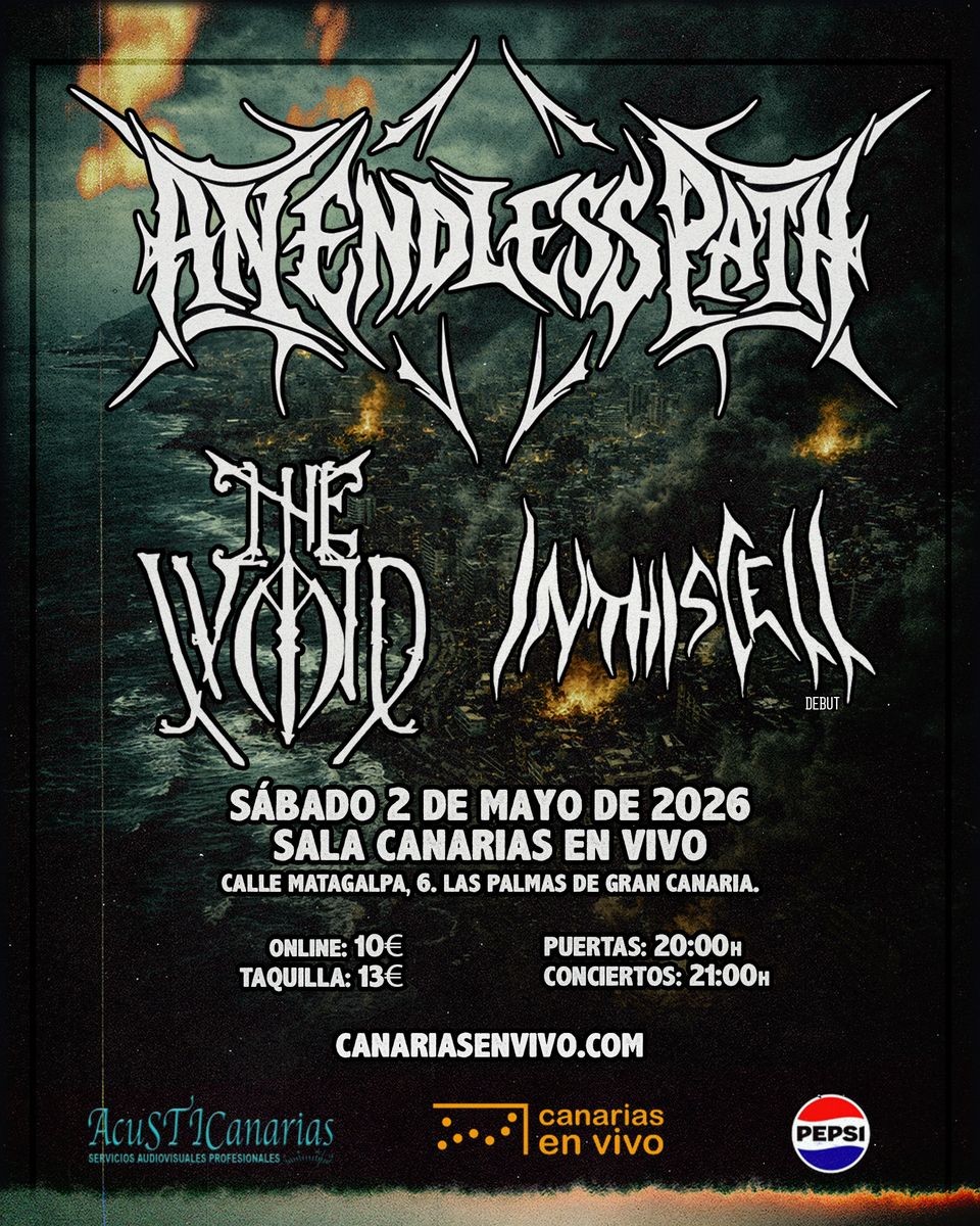The extreme metal band with the most powerful projection on the entire metal scene in the Canary Islands is coming to Canarias en Vivo: An Endless Path. After a post-pandemic break, they return this year stronger than ever. With tours already under their belt across mainland Spain, Mexico, and shows throughout the English-speaking world, this year they will be sharing the stage with top-tier bands such as Lamb of God, Ill Niño, In Flames, Godsmack, Within Temptation, Satyricon, Doro, Heaven Shall Burn, and many more. But not before stopping by here and giving us a taste of their powerful live show next May. They will also be joined by two more bands that will get the crowd warmed up in the best possible way for a perfect metal night: -The Void (Lovecraftian Symphonic Black/Death Metal) Currently semifinalists in the national Metal Battle for Wacken 2026. -In This Cell (Alternative Metalcore) They will debut as a band that night, although they already feature experienced musicians in their lineup, so the show is guaranteed. A more than complete, top-level evening you simply cannot miss! Only confirmed date in the Canary Islands for An Endless Path. Don’t miss it! Saturday, May 2nd at Canarias en Vivo. Date: Saturday, May 2nd, 2026 Venue: Sala de Eventos Canarias en Vivo Doors open: 20:00 Show starts: 21:00 Tickets: €10.52 online and €13 at the door.
