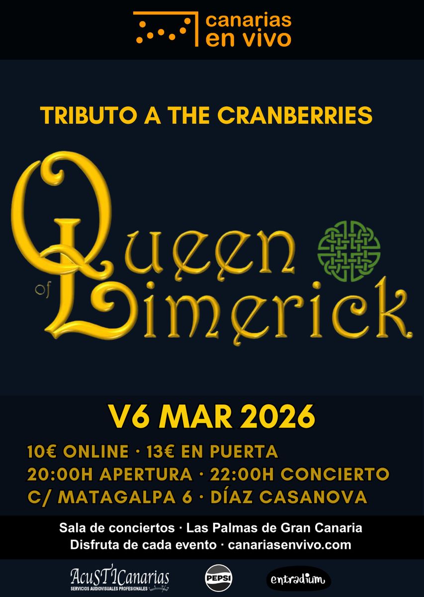 Tribute to The Cranberries by Queen of Limerick The music of The Cranberries continues to be a refuge, a memory, and a source of emotion. Queen of Limerick presents an acoustic tribute (guitar and voice) that pays homage to the iconic Irish band with sensitivity and a personal interpretation. A journey through the anthems of 90s alternative rock, brought into an intimate, close-up setting, designed for those who still feel these songs as part of their own story. A night to reconnect with melodies that never really left. Friday, March 6, 2026 Venue: Sala de Eventos Canarias en Vivo Doors open: 20:00 Concert starts: 22:00 Tickets: €10.52 online and €13 at the door.