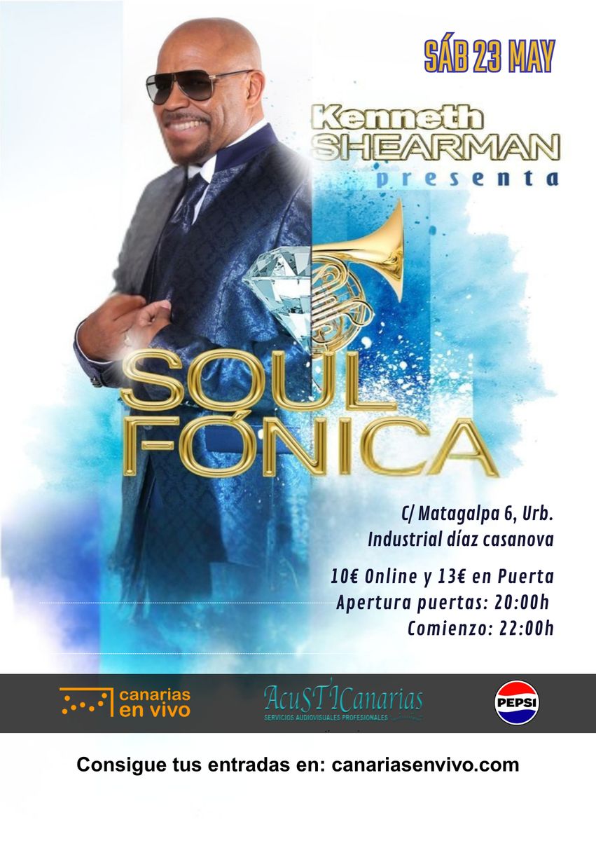 Soulfónica is a show that brings together the emotion of soul with the majesty of symphonic music. Created by Kenneth Shearman, the project fuses timeless soul classics with contemporary reinterpretations, giving rise to an intense and deeply moving sound experience. With a line-up of top-level musicians —many of them connected to the Conservatory of Las Palmas de Gran Canaria— Soulfónica stands out for its rich instrumentation, artistic versatility and multicultural essence. Each concert is tailored to the venue and the audience, becoming a unique experience where tradition and modernity engage in a dialogue without labels. More than a concert, Soulfónica is an emotional journey: a celebration of music as a universal language, capable of connecting souls, awakening memories and leaving an indelible mark on those who listen. Saturday, May 23 in Canarias en Vivo. Date: Saturday, May 23, 2026 Venue: Sala de Eventos Canarias en Vivo Doors open: 8:00 p.m. Concerts start: 10:00 p.m. Tickets: €10.52 online and €13 at the door.